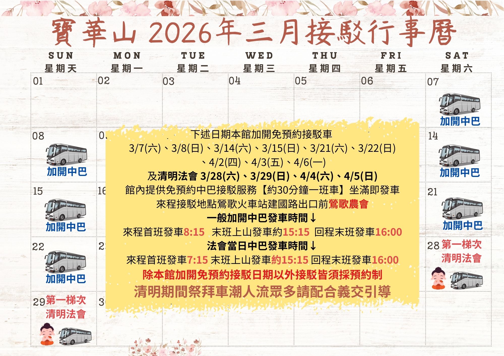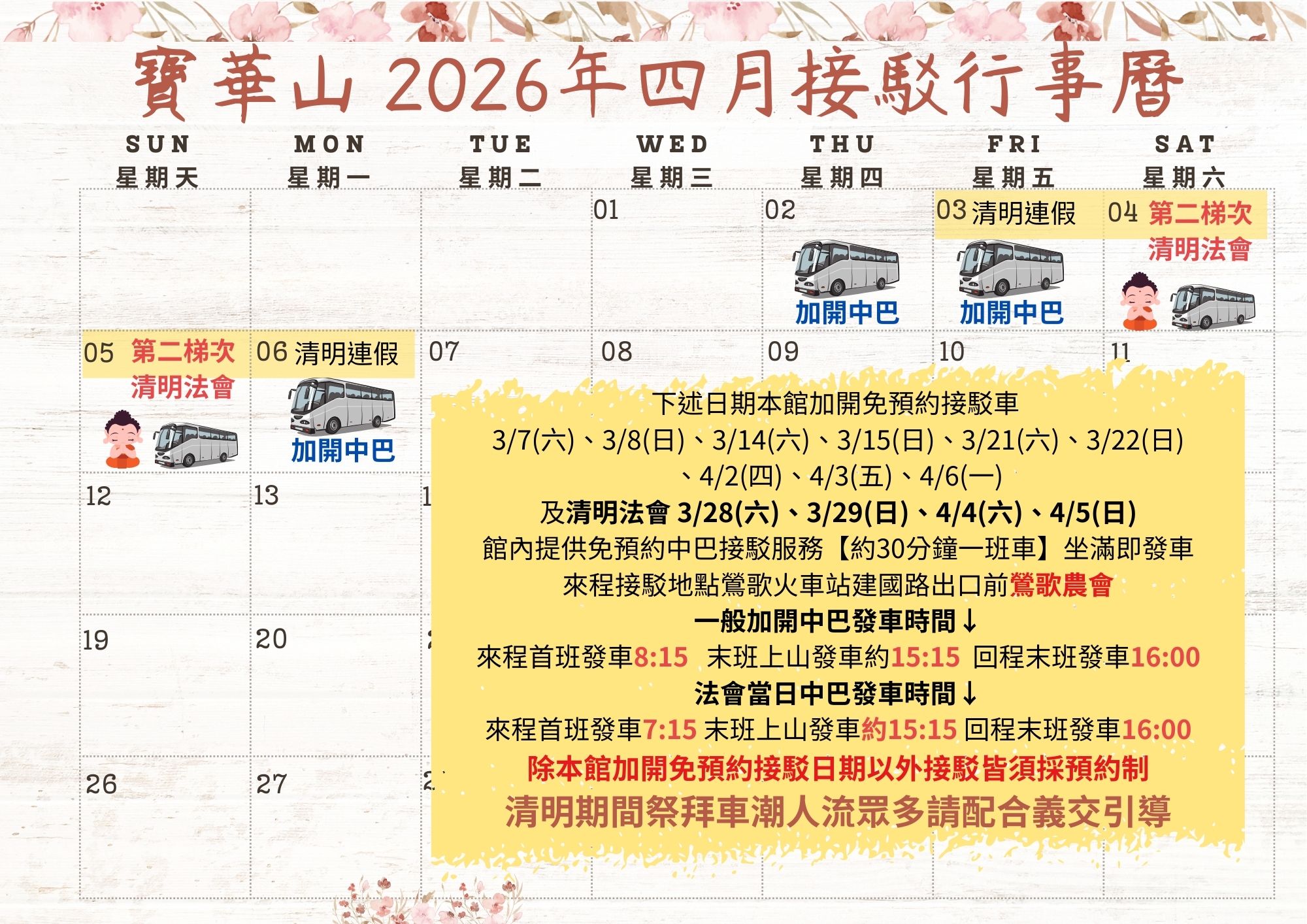 寶華山2026年三月、四月接駁行事曆